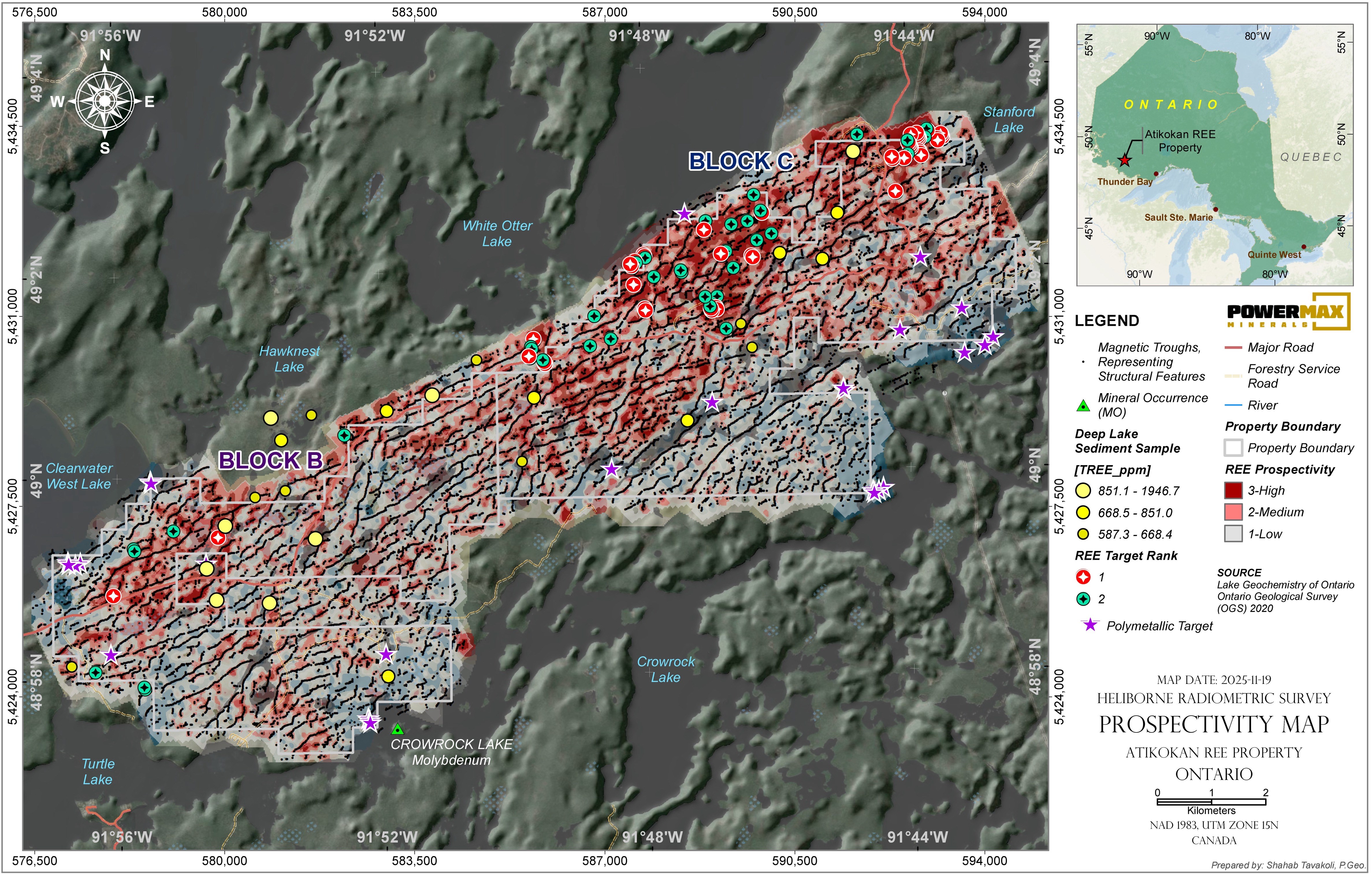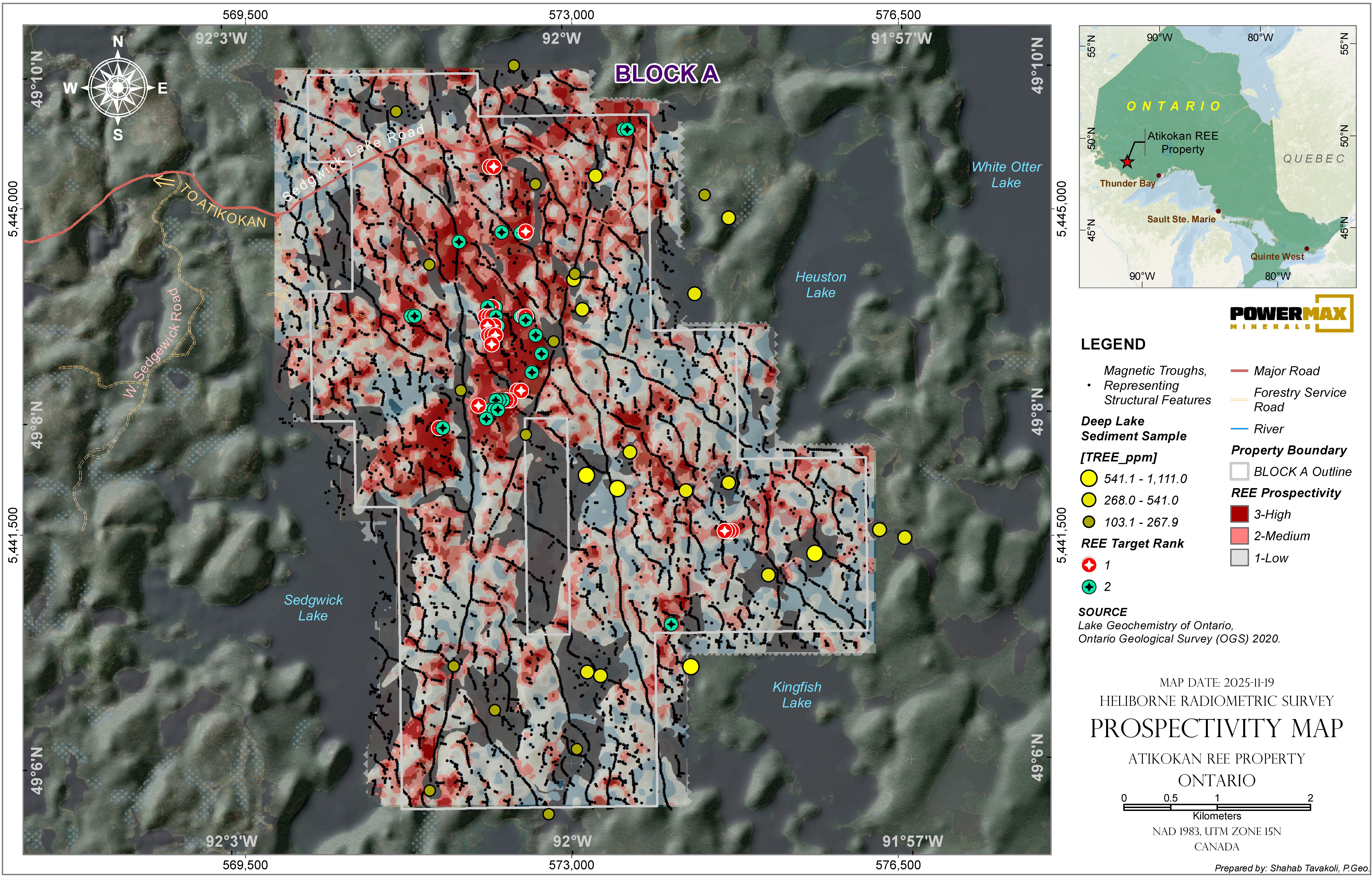 Toronto, Ontario–(Newsfile Corp. – January 12, 2026) – Powermax Minerals Inc. (CSE: PMAX) (“Powermax” or the “Company”) is pleased to announce interpretation results of a high-resolution helicopter-borne magnetic and radiometric survey completed over its Atikokan Rare Earth Element (REE) Property in northwestern Ontario. The survey results have identified multiple structurally controlled REE exploration targets across Blocks A, B, and C of the property, providing a strong technical foundation for integration with follow-up fieldwork data.