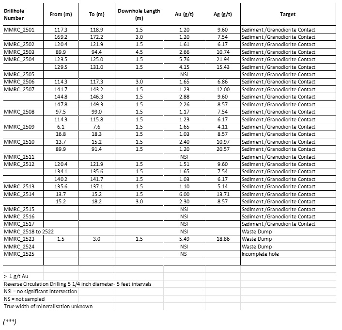 The drilling identified and extended the granodiorite -metasediment contact 200 metres to the north with Hole MMRC2504, an intersection of 1.5 metres at 5.76 g/t Au , 21.94 g/t Ag and 150 metres to the south where MMRC2514 is situated with 1.5 metres at 6 g/t Au and 13.71 g/t Ag