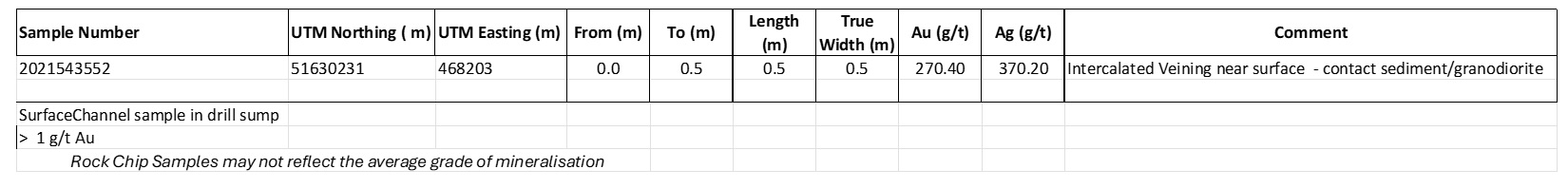 0.5 metres true width at 370 g/t Au and 270 g/t Ag sample # 2021543552Rock Chip Samples may not reflect the average grade of mineralisation.