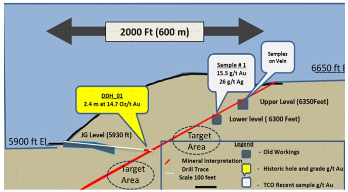 - Hole #1 was drilled 300 feet below the lowest recorded workings and recorded 14.7 Oz /ton Au (516 g/t Au)