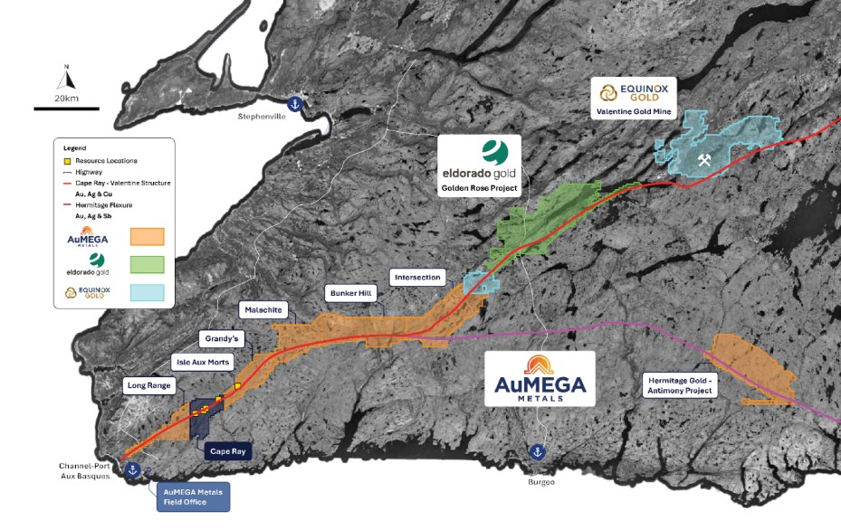 AuMEGA Metals Ltd (ASX: AAM) (TSXV: AUM) (OTCQB: AUMMF) is utilising best-in-class exploration to explore on its district scale land package that spans 110 kilometers along the Cape Ray-Valentine Shear Zone, a significant under-explored geological structure in Newfoundland, Canada. This zone currently hosts Equinox Gold’s Valentine Gold Project, a multi-million-ounce deposit which is the region’s largest gold project, along with AuMEGA’s expanding Mineral Resource.