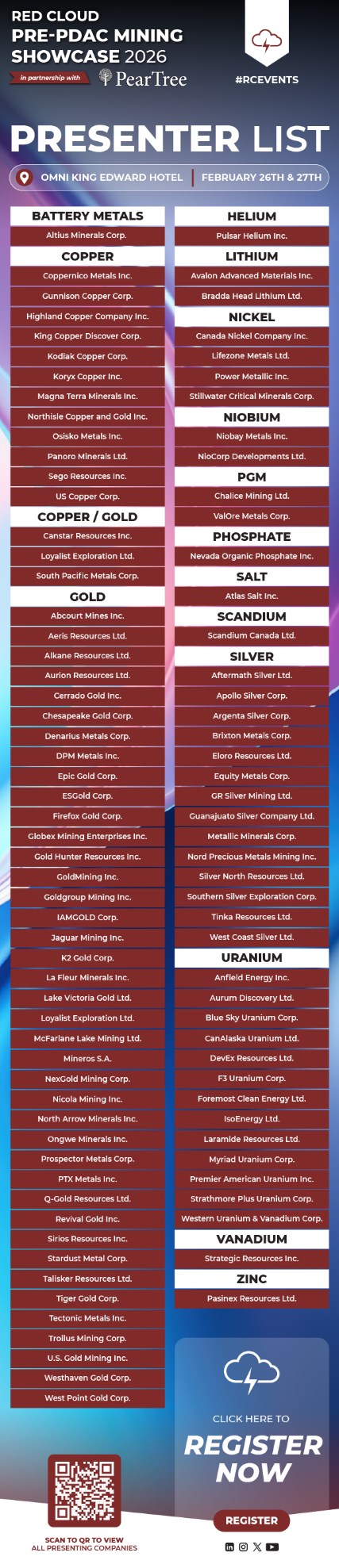 “The Pre-PDAC Mining Showcase creates an opportunity for companies to engage with investors in a more focused setting ahead of what is typically the busiest week of the year for the sector,” said Bruce Tatters, CEO of Red Cloud Securities. “Our goal is to provide a forum for meaningful conversations around project advancement, market conditions, and longer-term investment themes influencing the mining industry.”
