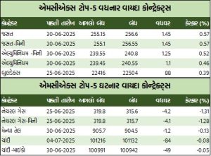 મુંબઈઃ દેશના અગ્રણી કોમોડિટી ડેરિવેટિવ્ઝ એક્સચેન્જ એમસીએક્સ પર વિવિધ કોમોડિટી વાયદા, ઓપ્શન્સ અને ઇન્ડેક્સ ફ્યુચર્સમાં રૂ.53163.99 કરોડનું ટર્નઓવર નોંધાયું હતું. કોમોડિટી વાયદાઓમાં રૂ.12694.98 કરોડનાં કામકાજ થયાં હતાં. કોમોડિટી ઓપ્શન્સમાં રૂ.40465.84 કરોડનું નોશનલ ટર્નઓવર નોંધાયું હતું. બુલિયન ઇન્ડેક્સ બુલડેક્સ જૂન વાયદો 22504 પોઇન્ટના સ્તરે પહોંચ્યો હતો. કોમોડિટી ઓપ્શન્સમાં કુલ પ્રીમિયમ ટર્નઓવર રૂ.764.81 કરોડનું થયું હતું.