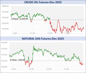 એનર્જી સેગમેન્ટમાં રૂ. 4227.33 કરોડનાં કામકાજ થયાં હતાં. એમસીએક્સ ઇલેક્ટ્રિસિટી ડિસેમ્બર વાયદો એમડબલ્યુએચદીઠ રૂ.4177ના ભાવે ખૂલી, ઉપરમાં રૂ.4289 અને નીચામાં રૂ.4175ના સ્તરને સ્પર્શી, રૂ.32 વધી રૂ.4206 થયો હતો. ક્રૂડ તેલ ડિસેમ્બર વાયદો બેરલદીઠ રૂ.5370ના ભાવે ખૂલી, ઉપરમાં રૂ.5372 અને નીચામાં રૂ.5331ના મથાળે અથડાઈ, રૂ.5356ના આગલા બંધ સામે રૂ.18 ઘટી રૂ.5338ના સ્તરે પહોંચ્યો હતો. ક્રૂડ તેલ-મિની ડિસેમ્બર વાયદો રૂ.18 ઘટી રૂ.5338 થયો હતો. નેચરલ ગેસ ડિસેમ્બર વાયદો એમએમબીટીયુદીઠ રૂ.1.4 ઘટી રૂ.448.6ના ભાવે ટ્રેડ થઈ રહ્યો હતો. નેચરલ ગેસ-મિની ડિસેમ્બર વાયદો રૂ.1 ઘટી રૂ.449ના ભાવે ટ્રેડ થઈ રહ્યો હતો.