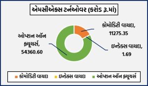 મુંબઈઃ દેશના અગ્રણી કોમોડિટી ડેરિવેટિવ્ઝ એક્સચેન્જ એમસીએક્સ પર વિવિધ કોમોડિટી વાયદા, ઓપ્શન્સ અને ઇન્ડેક્સ ફ્યુચર્સમાં રૂ.65637.64 કરોડનું ટર્નઓવર નોંધાયું હતું. કોમોડિટી વાયદાઓમાં રૂ.11275.35 કરોડનાં કામકાજ થયાં હતાં. કોમોડિટી ઓપ્શન્સમાં રૂ.54360.6 કરોડનું નોશનલ ટર્નઓવર નોંધાયું હતું. બુલિયન ઇન્ડેક્સ બુલડેક્સ ઓગસ્ટ વાયદો 23404 પોઇન્ટના સ્તરે હતો. કોમોડિટી ઓપ્શન્સમાં કુલ પ્રીમિયમ ટર્નઓવર રૂ.861.62 કરોડનું થયું હતું.