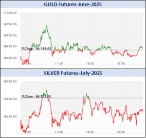 કીમતી ધાતુઓમાં સોના-ચાંદીના વાયદાઓમાં રૂ.9210.11 કરોડનાં કામકાજ થયાં હતાં. એમસીએક્સ સોનું જૂન વાયદો 10 ગ્રામદીઠ રૂ.96020ના ભાવે ખૂલી, ઉપરમાં રૂ.96741 અને નીચામાં રૂ.95834ના મથાળે અથડાઈ, રૂ.96168ના આગલા બંધ સામે રૂ.2 ઘટી રૂ.96166ના ભાવે ટ્રેડ થઈ રહ્યો હતો. ગોલ્ડ-ગિની મે વાયદો 8 ગ્રામદીઠ રૂ.37 ઘટી રૂ.77434ના ભાવે ટ્રેડ થઈ રહ્યો હતો. ગોલ્ડ-પેટલ મે વાયદો 1 ગ્રામદીઠ રૂ.2 ઘટી રૂ.9703ના ભાવે બોલાયો હતો. સોનું-મિની જૂન વાયદો 10 ગ્રામદીઠ રૂ.22 વધી રૂ.96175ના ભાવે બોલાયો હતો. ગોલ્ડ-ટેન મે વાયદો 10 ગ્રામદીઠ રૂ.96400ના ભાવે ખૂલી, ઉપરમાં રૂ.96928 અને નીચામાં રૂ.96057ના સ્તરને સ્પર્શી, રૂ.96401ના આગલા બંધ સામે રૂ.19 વધી રૂ.96420ના ભાવે ટ્રેડ થઈ રહ્યો હતો.