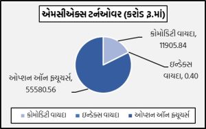 મુંબઈઃ દેશના અગ્રણી કોમોડિટી ડેરિવેટિવ્ઝ એક્સચેન્જ એમસીએક્સ પર વિવિધ કોમોડિટી વાયદા, ઓપ્શન્સ અને ઇન્ડેક્સ ફ્યુચર્સમાં રૂ.67486.79 કરોડનું ટર્નઓવર નોંધાયું હતું. કોમોડિટી વાયદાઓમાં રૂ.11905.84 કરોડનાં કામકાજ થયાં હતાં. કોમોડિટી ઓપ્શન્સમાં રૂ.55580.56 કરોડનું નોશનલ ટર્નઓવર નોંધાયું હતું. બુલિયન ઇન્ડેક્સ બુલડેક્સ મે વાયદો 22132 પોઇન્ટના સ્તરે પહોંચ્યો હતો. કોમોડિટી ઓપ્શન્સમાં કુલ પ્રીમિયમ ટર્નઓવર રૂ.874.11 કરોડનું થયું હતું.