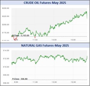 એનર્જી સેગમેન્ટમાં રૂ.1236.61 કરોડનાં કામકાજ થયાં હતાં. એમસીએક્સ ક્રૂડ તેલ મે વાયદો બેરલદીઠ રૂ.5162ના ભાવે ખૂલી, ઉપરમાં રૂ.5235 અને નીચામાં રૂ.5150ના સ્તરને સ્પર્શી, રૂ.5163ના આગલા બંધ સામે રૂ.69 વધી રૂ.5232ના ભાવે બોલાયો હતો. ક્રૂડ તેલ-મિની મે વાયદો રૂ.72 વધી રૂ.5234ના સ્તરે પહોંચ્યો હતો. નેચરલ ગેસ મે વાયદો એમએમબીટીયુદીઠ રૂ.4.7 વધી રૂ.311.5 થયો હતો. નેચરલ ગેસ-મિની મે વાયદો રૂ.4.5 વધી રૂ.311.4 થયો હતો.