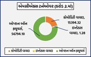 મુંબઈઃ દેશના અગ્રણી કોમોડિટી ડેરિવેટિવ્ઝ એક્સચેન્જ એમસીએક્સ પર વિવિધ કોમોડિટી વાયદા, ઓપ્શન્સ અને ઇન્ડેક્સ ફ્યુચર્સમાં રૂ.72189.71 કરોડનું ટર્નઓવર નોંધાયું હતું. કોમોડિટી વાયદાઓમાં રૂ.15394.32 કરોડનાં કામકાજ થયાં હતાં. કોમોડિટી ઓપ્શન્સમાં રૂ.56794.1 કરોડનું નોશનલ ટર્નઓવર નોંધાયું હતું. બુલિયન ઇન્ડેક્સ બુલડેક્સ જૂન વાયદો 22509 પોઇન્ટના સ્તરે હતો. કોમોડિટી ઓપ્શન્સમાં કુલ પ્રીમિયમ ટર્નઓવર રૂ.926.87 કરોડનું થયું હતું.