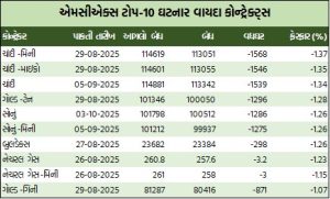 કીમતી ધાતુઓમાં સોના-ચાંદીના વાયદાઓમાં રૂ.18820.94 કરોડનાં કામકાજ થયાં હતાં. એમસીએક્સ સોનું ઓક્ટોબર વાયદો 10 ગ્રામદીઠ રૂ.101198ના ભાવે ખૂલી, ઉપરમાં રૂ.101199 અને નીચામાં રૂ.100368ના સ્તરને સ્પર્શી, રૂ.101798ના આગલા બંધ સામે રૂ.1286ના ભાવઘટાડા સાથે રૂ.100512 થયો હતો. ગોલ્ડ-ગિની ઓગસ્ટ વાયદો 8 ગ્રામદીઠ રૂ.871 ઘટી રૂ.80416ના ભાવે ટ્રેડ થઈ રહ્યો હતો. ગોલ્ડ-પેટલ ઓગસ્ટ વાયદો 1 ગ્રામદીઠ રૂ.107 ઘટી રૂ.10066ના ભાવે બોલાયો હતો. સોનું-મિની સપ્ટેમ્બર વાયદો 10 ગ્રામદીઠ રૂ.1275 ઘટી રૂ.99937ના ભાવે બોલાયો હતો. ગોલ્ડ-ટેન ઓગસ્ટ વાયદો 10 ગ્રામદીઠ રૂ.101001ના ભાવે ખૂલી, ઉપરમાં રૂ.101001 અને નીચામાં રૂ.99916ના મથાળે અથડાઈ, રૂ.101346ના આગલા બંધ સામે રૂ.1296ના ભાવઘટાડા સાથે રૂ.100050ના ભાવે બોલાયો હતો.