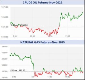 એનર્જી સેગમેન્ટમાં રૂ. 3498.97 કરોડનાં કામકાજ થયાં હતાં. એમસીએક્સ ઇલેક્ટ્રિસિટી નવેમ્બર વાયદો એમડબલ્યુએચદીઠ રૂ.3175ના ભાવે ખૂલી, ઉપરમાં રૂ.3237 અને નીચામાં રૂ.3133ના મથાળે અથડાઈ, રૂ.30 ઘટી રૂ.3147ના સ્તરે પહોંચ્યો હતો. ક્રૂડ તેલ નવેમ્બર વાયદો બેરલદીઠ રૂ.5342ના ભાવે ખૂલી, ઉપરમાં રૂ.5364 અને નીચામાં રૂ.5300ના સ્તરને સ્પર્શી, રૂ.5328ના આગલા બંધ સામે રૂ.31 વધી રૂ.5359ના ભાવે ટ્રેડ થઈ રહ્યો હતો. ક્રૂડ તેલ-મિની નવેમ્બર વાયદો રૂ.29 વધી રૂ.5358ના સ્તરે પહોંચ્યો હતો. નેચરલ ગેસ નવેમ્બર વાયદો એમએમબીટીયુદીઠ 30 પૈસા વધી રૂ.382.4 થયો હતો. નેચરલ ગેસ-મિની નવેમ્બર વાયદો 30 પૈસા વધી રૂ.382.3ના સ્તરે પહોંચ્યો હતો.