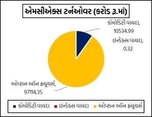 મુંબઈઃ દેશના અગ્રણી કોમોડિટી ડેરિવેટિવ્ઝ એક્સચેન્જ એમસીએક્સ પર વિવિધ કોમોડિટી વાયદા, ઓપ્શન્સ અને ઇન્ડેક્સ ફ્યુચર્સમાં રૂ.107649.66 કરોડનું ટર્નઓવર નોંધાયું હતું. કોમોડિટી વાયદાઓમાં રૂ.10534.99 કરોડનાં કામકાજ થયાં હતાં. કોમોડિટી ઓપ્શન્સમાં રૂ.97114.35 કરોડનું નોશનલ ટર્નઓવર નોંધાયું હતું. બુલિયન ઇન્ડેક્સ બુલડેક્સ એપ્રિલ વાયદો 21514 પોઇન્ટના સ્તરે પહોંચ્યો હતો. કોમોડિટી ઓપ્શન્સમાં કુલ પ્રીમિયમ ટર્નઓવર રૂ.1189.69 કરોડનું થયું હતું.
