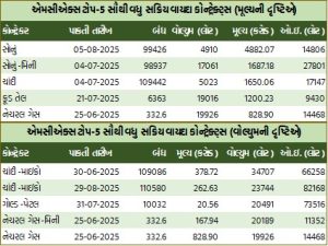 મિની કોલ ઓપ્શન્સમાં ક્રૂડ તેલ-મિની જુલાઈ રૂ.6500ની સ્ટ્રાઇક પ્રાઇસવાળો કોલ ઓપ્શન બેરલદીઠ રૂ.38.9 વધી રૂ.448.4ના ભાવે બોલાયો હતો. નેચરલ ગેસ-મિની જૂન રૂ.335ની સ્ટ્રાઇક પ્રાઇસવાળો કોલ ઓપ્શન એમએમબીટીયૂદીઠ રૂ.1.15 વધી રૂ.9.85ના ભાવે બોલાયો હતો. સોનું-મિની જૂન રૂ.100000ની સ્ટ્રાઇક પ્રાઇસવાળો કોલ ઓપ્શન 10 ગ્રામદીઠ રૂ.74 ઘટી રૂ.672ના ભાવે બોલાયો હતો. ચાંદી-મિની જૂન રૂ.110000ની સ્ટ્રાઇક પ્રાઇસવાળો કોલ ઓપ્શન કિલોદીઠ રૂ.59.5 વધી રૂ.611ના ભાવે બોલાયો હતો.