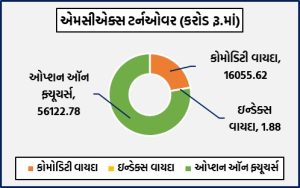 મુંબઈઃ દેશના અગ્રણી કોમોડિટી ડેરિવેટિવ્ઝ એક્સચેન્જ એમસીએક્સ પર વિવિધ કોમોડિટી વાયદા, ઓપ્શન્સ અને ઇન્ડેક્સ ફ્યુચર્સમાં રૂ.72180.28 કરોડનું ટર્નઓવર નોંધાયું હતું. કોમોડિટી વાયદાઓમાં રૂ.16055.62 કરોડનાં કામકાજ થયાં હતાં. કોમોડિટી ઓપ્શન્સમાં રૂ.56122.78 કરોડનું નોશનલ ટર્નઓવર નોંધાયું હતું. બુલિયન ઇન્ડેક્સ બુલડેક્સ જૂન વાયદો 23180 પોઇન્ટના સ્તરે હતો. કોમોડિટી ઓપ્શન્સમાં કુલ પ્રીમિયમ ટર્નઓવર રૂ.1356.41 કરોડનું થયું હતું.
