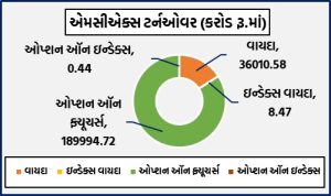 મુંબઈઃ દેશના અગ્રણી કોમોડિટી ડેરિવેટિવ્ઝ એક્સચેન્જ એમસીએક્સ પર વિવિધ કોમોડિટી વાયદા, ઓપ્શન્સ તથા ઇન્ડેક્સ ફ્યુચર્સ અને ઓપ્શન્સમાં રૂ.226014.21 કરોડનું ટર્નઓવર નોંધાયું હતું. કોમોડિટી વાયદાઓમાં રૂ.36010.58 કરોડનાં કામકાજ થયાં હતાં. કોમોડિટી વાયદા પરના ઓપ્શન્સમાં રૂ.189994.72 કરોડનું નોશનલ ટર્નઓવર નોંધાયું હતું. ઇન્ડેક્સ વાયદાઓમાં રૂ.8.47 કરોડ અને ઇન્ડેક્સ ઓપ્શન્સમાં રૂ..44 કરોડનાં કામકાજ થયાં હતાં. બુલિયન ઇન્ડેક્સ બુલડેક્સ નવેમ્બર વાયદો 28880 પોઇન્ટના સ્તરે ટ્રેડ થઈ રહ્યો હતો. કોમોડિટી ઓપ્શન્સમાં કુલ પ્રીમિયમ ટર્નઓવર રૂ.1851.98 કરોડનું થયું હતું.