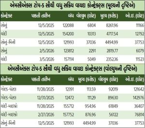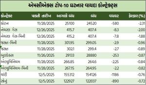 કોમોડિટી વાયદા પરના ઓપ્શન્સમાં કોલ ઓપ્શન્સની વાત કરીએ તો, ક્રૂડ તેલ ડિસેમ્બર રૂ.5300ની સ્ટ્રાઇક પ્રાઇસવાળો કોલ ઓપ્શન બેરલદીઠ રૂ.3.1 ઘટી રૂ.200.9 થયો હતો. જ્યારે નેચરલ ગેસ નવેમ્બર રૂ.390ની સ્ટ્રાઇક પ્રાઇસવાળો કોલ ઓપ્શન એમએમબીટીયૂદીઠ રૂ.6.25 ઘટી રૂ.7.7ના ભાવે બોલાયો હતો.