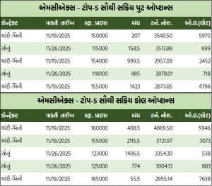 પુટ ઓપ્શન્સની વાત કરીએ તો, ક્રૂડ તેલ ડિસેમ્બર રૂ.5300ની સ્ટ્રાઇક પ્રાઇસવાળો પુટ ઓપ્શન બેરલદીઠ રૂ.5.1 વધી રૂ.181.5ના ભાવે બોલાયો હતો. જ્યારે નેચરલ ગેસ નવેમ્બર રૂ.380ની સ્ટ્રાઇક પ્રાઇસવાળો પુટ ઓપ્શન એમએમબીટીયૂદીઠ રૂ.2.6 વધી રૂ.7.65ના ભાવે બોલાયો હતો.