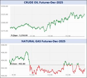 એનર્જી સેગમેન્ટમાં રૂ. 3140.10 કરોડનાં કામકાજ થયાં હતાં. એમસીએક્સ ઇલેક્ટ્રિસિટી નવેમ્બર વાયદો એમડબલ્યુએચદીઠ રૂ.2929ના ભાવે ખૂલી, ઉપરમાં રૂ.2970 અને નીચામાં રૂ.2920ના સ્તરને સ્પર્શી, રૂ.13 ઘટી રૂ.2928 થયો હતો. ક્રૂડ તેલ ડિસેમ્બર વાયદો બેરલદીઠ રૂ.5257ના ભાવે ખૂલી, ઉપરમાં રૂ.5334 અને નીચામાં રૂ.5257ના સ્તરને સ્પર્શી, રૂ.5258ના આગલા બંધ સામે રૂ.62 વધી રૂ.5320 થયો હતો. ક્રૂડ તેલ-મિની ડિસેમ્બર વાયદો રૂ.65 વધી રૂ.5322ના ભાવે ટ્રેડ થઈ રહ્યો હતો. નેચરલ ગેસ નવેમ્બર વાયદો એમએમબીટીયુદીઠ રૂ.1.5 ઘટી રૂ.401.3 થયો હતો. નેચરલ ગેસ-મિની નવેમ્બર વાયદો રૂ.1.6 ઘટી રૂ.401.3 થયો હતો.
