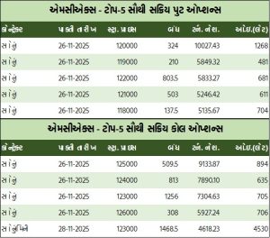 પુટ ઓપ્શન્સની વાત કરીએ તો, ક્રૂડ તેલ ડિસેમ્બર રૂ.5200ની સ્ટ્રાઇક પ્રાઇસવાળો પુટ ઓપ્શન બેરલદીઠ રૂ.36.7 વધી રૂ.192.3ના ભાવે બોલાયો હતો. જ્યારે નેચરલ ગેસ ડિસેમ્બર રૂ.400ની સ્ટ્રાઇક પ્રાઇસવાળો પુટ ઓપ્શન એમએમબીટીયૂદીઠ રૂ.1.45 ઘટી રૂ.21.15ના ભાવે બોલાયો હતો.