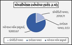 મુંબઈઃ દેશના અગ્રણી કોમોડિટી ડેરિવેટિવ્ઝ એક્સચેન્જ એમસીએક્સ પર વિવિધ કોમોડિટી વાયદા, ઓપ્શન્સ અને ઇન્ડેક્સ ફ્યુચર્સમાં રૂ.113705.91 કરોડનું ટર્નઓવર નોંધાયું હતું. કોમોડિટી વાયદાઓમાં રૂ.21701.71 કરોડનાં કામકાજ થયાં હતાં. કોમોડિટી ઓપ્શન્સમાં રૂ.92003.67 કરોડનું નોશનલ ટર્નઓવર નોંધાયું હતું. બુલિયન ઇન્ડેક્સ બુલડેક્સ મે વાયદો 22023 પોઇન્ટના સ્તરે પહોંચ્યો હતો. કોમોડિટી ઓપ્શન્સમાં કુલ પ્રીમિયમ ટર્નઓવર રૂ.1119.52 કરોડનું થયું હતું.