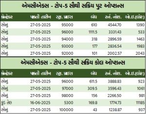 સોનું મે રૂ.95000ની સ્ટ્રાઇક પ્રાઇસવાળો પુટ ઓપ્શન 10 ગ્રામદીઠ રૂ.48 ઘટી રૂ.596 થયો હતો. આ સામે ચાંદી જૂન રૂ.98000ની સ્ટ્રાઇક પ્રાઇસવાળો પુટ ઓપ્શન કિલોદીઠ રૂ.251.5 વધી રૂ.3028ના ભાવે બોલાયો હતો. તાંબું મે રૂ.860ની સ્ટ્રાઇક પ્રાઇસવાળો પુટ ઓપ્શન કિલોદીઠ 38 પૈસા વધી રૂ.7.05 થયો હતો. જસત મે રૂ.255ની સ્ટ્રાઇક પ્રાઇસવાળો પુટ ઓપ્શન કિલોદીઠ 34 પૈસા વધી રૂ.0.7 થયો હતો.