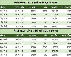 મિની પુટ ઓપ્શન્સમાં ક્રૂડ તેલ-મિની ડિસેમ્બર રૂ.5200ની સ્ટ્રાઇક પ્રાઇસવાળો પુટ ઓપ્શન બેરલદીઠ રૂ.36.95 ઘટી રૂ.139.25 થયો હતો. નેચરલ ગેસ-મિની ડિસેમ્બર રૂ.410ની સ્ટ્રાઇક પ્રાઇસવાળો પુટ ઓપ્શન એમએમબીટીયૂદીઠ 90 પૈસા ઘટી રૂ.27.35 થયો હતો. સોનું-મિની નવેમ્બર રૂ.125000ની સ્ટ્રાઇક પ્રાઇસવાળો પુટ ઓપ્શન 10 ગ્રામદીઠ રૂ.86.5 ઘટી રૂ.260ના ભાવે બોલાયો હતો. ચાંદી-મિની ડિસેમ્બર રૂ.160000ની સ્ટ્રાઇક પ્રાઇસવાળો પુટ ઓપ્શન કિલોદીઠ રૂ.198 ઘટી રૂ.3530ના ભાવે બોલાયો હતો.