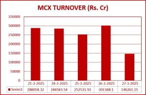 કીમતી ધાતુઓના વાયદાઓમાં સોના-ચાંદીમાં એમસીએક્સ પર 8,57,184 સોદાઓમાં રૂ.1,03,919.11 કરોડનાં કામકાજ થયાં હતાં. સોનાના વાયદાઓમાં એમસીએક્સ સોનું એપ્રિલ વાયદો સપ્તાહના પ્રારંભે 10 ગ્રામદીઠ રૂ.88,431ના ભાવે ખૂલી, સપ્તાહ દરમિયાન ઈન્ટ્રા-ડેમાં ઉપરમાં રૂ.88,619 અને નીચામાં રૂ.87,172ના મથાળે અથડાઈ, સપ્તાહનાં અંતે રૂ.322 ઘટી રૂ.88,384ના ભાવે પહોંચ્યો હતો.  ગોલ્ડ-ગિની એપ્રિલ કોન્ટ્રેક્ટ 8 ગ્રામદીઠ રૂ.389 ઘટી રૂ.71,704 અને ગોલ્ડ-પેટલ એપ્રિલ કોન્ટ્રેક્ટ 1 ગ્રામદીઠ રૂ.42 ઘટી રૂ.9,024ના ભાવે પહોંચ્યો હતો. સોનું-મિની એપ્રિલ વાયદો 10 ગ્રામદીઠ રૂ.433 ઘટી રૂ.88,213ના સ્તરે પહોંચ્યો હતો.