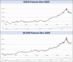 સમીક્ષા હેઠળના સપ્તાહ દરમિયાન કીમતી ધાતુઓમાં સોના-ચાંદીના વાયદાઓમાં રૂ.285662.07 કરોડનાં કામકાજ થયાં હતાં. એમસીએક્સ સોનું ડિસેમ્બર વાયદો સપ્તાહના પ્રારંભે 10 ગ્રામદીઠ રૂ.123587ના ભાવે ખૂલી, સપ્તાહ દરમિયાન ઇન્ટ્રા-ડેમાં ઉપરમાં રૂ.124239 અને નીચામાં રૂ.117628ના સ્તરને સ્પર્શી, રૂ.124104ના આગલા બંધ સામે સપ્તાહના અંતે રૂ.2596ના ભાવઘટાડા સાથે રૂ.121508ના ભાવે બંધ થયો હતો. ગોલ્ડ-ગિની નવેમ્બર વાયદો 8 ગ્રામદીઠ સપ્તાહના અંતે રૂ.1914 ઘટી રૂ.98107 થયો હતો. ગોલ્ડ-પેટલ નવેમ્બર વાયદો 1 ગ્રામદીઠ રૂ.272 ઘટી સપ્તાહના અંતે રૂ.12258 થયો હતો. સોનું-મિની ડિસેમ્બર વાયદો 10 ગ્રામદીઠ રૂ.2628 ઘટી રૂ.121457ના ભાવે સપ્તાહના અંતે બોલાયો હતો. ગોલ્ડ-ટેન નવેમ્બર વાયદો સપ્તાહના પ્રારંભે 10 ગ્રામદીઠ રૂ.123603ના ભાવે ખૂલી, સપ્તાહ દરમિયાન ઇન્ટ્રા-ડેમાં ઉપરમાં રૂ.124450 અને નીચામાં રૂ.117916ના સ્તરને સ્પર્શી, રૂ.124373ના આગલા બંધ સામે સપ્તાહના અંતે રૂ.2679 ઘટી રૂ.121694ના ભાવે બંધ થયો હતો.