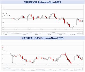 એનર્જી સેગમેન્ટમાં રૂ.45057.28 કરોડનાં કામકાજ થયાં હતાં. એમસીએક્સ ઇલેક્ટ્રિસિટી નવેમ્બર વાયદો સપ્તાહના પ્રારંભે એમડબલ્યુએચદીઠ રૂ.3213ના ભાવે ખૂલી, સપ્તાહ દરમિયાન ઇન્ટ્રા-ડેમાં ઉપરમાં રૂ.3213 અને નીચામાં રૂ.2856ના મથાળે અથડાઈ, સપ્તાહના અંતે રૂ.335 ઘટી રૂ.2865ના ભાવે બોલાયો હતો. ક્રૂડ તેલ નવેમ્બર વાયદો સપ્તાહના પ્રારંભે બેરલદીઠ રૂ.5420ના ભાવે ખૂલી, સપ્તાહ દરમિયાન ઇન્ટ્રા-ડેમાં ઉપરમાં રૂ.5510 અને નીચામાં રૂ.5285ના મથાળે અથડાઈ, રૂ.5437ના આગલા બંધ સામે સપ્તાહના અંતે રૂ.46 ઘટી રૂ.5391 થયો હતો. ક્રૂડ તેલ-મિની નવેમ્બર વાયદો સપ્તાહના અંતે રૂ.46 ઘટી રૂ.5391ના સ્તરે પહોંચ્યો હતો. નેચરલ ગેસ નવેમ્બર વાયદો એમએમબીટીયુદીઠ રૂ.7.8 ઘટી રૂ.348.6ના ભાવે સપ્તાહના અંતે બંધ થયો હતો. નેચરલ ગેસ-મિની નવેમ્બર વાયદો સપ્તાહના અંતે રૂ.8 ઘટી રૂ.348.5 થયો હતો.