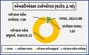 મુંબઈઃ દેશના અગ્રણી કોમોડિટી ડેરિવેટિવ્ઝ એક્સચેન્જ એમસીએક્સ પર વિવિધ કોમોડિટી વાયદા, ઓપ્શન્સ તથા ઇન્ડેક્સ ફ્યુચર્સ અને ઓપ્શન્સમાં રૂ.464802.19 કરોડનું ટર્નઓવર નોંધાયું હતું. કોમોડિટી વાયદાઓમાં રૂ.28223.88 કરોડનાં કામકાજ થયાં હતાં. કોમોડિટી વાયદા પરના ઓપ્શન્સમાં રૂ.436576.22 કરોડનું નોશનલ ટર્નઓવર નોંધાયું હતું. ઇન્ડેક્સ વાયદાઓમાં રૂ.1.03 કરોડ અને ઇન્ડેક્સ ઓપ્શન્સમાં રૂ.1.06 કરોડનાં કામકાજ થયાં હતાં. બુલિયન ઇન્ડેક્સ બુલડેક્સ નવેમ્બર વાયદો 28618 પોઇન્ટના સ્તરે ટ્રેડ થઈ રહ્યો હતો. કોમોડિટી ઓપ્શન્સમાં કુલ પ્રીમિયમ ટર્નઓવર રૂ.2164.63 કરોડનું થયું હતું.