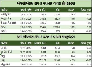 કોમોડિટી વાયદાઓમાં રૂ.28223.88 કરોડ અને કોમોડિટી ઓપ્શન્સમાં રૂ.436576.22 કરોડનું ટર્નઓવરઃ સોના-ચાંદીના વાયદાઓમાં રૂ. 23413.73 કરોડનાં કામકાજઃ બુલિયન ઇન્ડેક્સ બુલડેક્સ વાયદો 28618 પોઇન્ટના સ્તરે