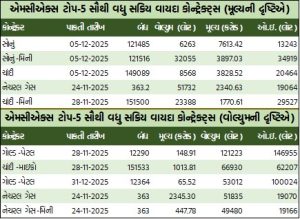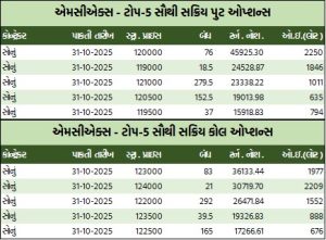 સોનું ઓક્ટોબર રૂ.122000ની સ્ટ્રાઇક પ્રાઇસવાળો કોલ ઓપ્શન 10 ગ્રામદીઠ રૂ.353 ઘટી રૂ.365.5 થયો હતો. આ સામે ચાંદી નવેમ્બર રૂ.150000ની સ્ટ્રાઇક પ્રાઇસવાળો કોલ ઓપ્શન કિલોદીઠ રૂ.183.5 વધી રૂ.4191.5 થયો હતો. તાંબું નવેમ્બર રૂ.1020ની સ્ટ્રાઇક પ્રાઇસવાળો કોલ ઓપ્શન કિલોદીઠ રૂ.1.72 ઘટી રૂ.24.15ના ભાવે બોલાયો હતો. જસત નવેમ્બર રૂ.300ની સ્ટ્રાઇક પ્રાઇસવાળો કોલ ઓપ્શન કિલોદીઠ 65 પૈસા ઘટી રૂ.7 થયો હતો.