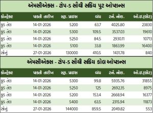 કોમોડિટી વાયદા પરના ઓપ્શન્સમાં કોલ ઓપ્શન્સની વાત કરીએ તો, ક્રૂડ તેલ જાન્યુઆરી રૂ.5300ની સ્ટ્રાઇક પ્રાઇસવાળો કોલ ઓપ્શન બેરલદીઠ રૂ.7.2 વધી રૂ.100.3 થયો હતો. જ્યારે નેચરલ ગેસ જાન્યુઆરી રૂ.310ની સ્ટ્રાઇક પ્રાઇસવાળો કોલ ઓપ્શન એમએમબીટીયૂદીઠ રૂ.2.05 ઘટી રૂ.21.25 થયો હતો.