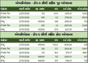 પુટ ઓપ્શન્સની વાત કરીએ તો, ક્રૂડ તેલ ફેબ્રુઆરી રૂ.5400ની સ્ટ્રાઇક પ્રાઇસવાળો પુટ ઓપ્શન બેરલદીઠ રૂ.19 વધી રૂ.245.2ના ભાવે બોલાયો હતો. જ્યારે નેચરલ ગેસ જાન્યુઆરી રૂ.310ની સ્ટ્રાઇક પ્રાઇસવાળો પુટ ઓપ્શન એમએમબીટીયૂદીઠ રૂ.23.3 ઘટી રૂ.10.15ના ભાવે બોલાયો હતો.