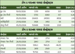 સમીક્ષા હેઠળના સપ્તાહ દરમિયાન કીમતી ધાતુઓમાં સોના-ચાંદીના વાયદાઓમાં રૂ.188097.59 કરોડનાં કામકાજ થયાં હતાં. એમસીએક્સ સોનું એપ્રિલ વાયદો સપ્તાહના પ્રારંભે 10 ગ્રામદીઠ રૂ.153750ના ભાવે ખૂલી, સપ્તાહ દરમિયાન ઇન્ટ્રા-ડેમાં ઉપરમાં રૂ.157185 અને નીચામાં રૂ.150730ના મથાળે અથડાઈ, રૂ.152836ના આગલા બંધ સામે સપ્તાહના અંતે રૂ.1983ના ઉછાળા સાથે રૂ.154819ના ભાવે બંધ થયો હતો. ગોલ્ડ-ગિની ફેબ્રુઆરી વાયદો સપ્તાહના અંતે 8 ગ્રામદીઠ રૂ.1147ની તેજી સાથે રૂ.126124ના ભાવે બંધ થયો હતો. ગોલ્ડ-પેટલ ફેબ્રુઆરી વાયદો 1 ગ્રામદીઠ રૂ.152ની વૃદ્ધિ સાથે રૂ.15830ના ભાવે સપ્તાહના અંતે બંધ થયો હતો. સોનું-મિની માર્ચ વાયદો 10 ગ્રામદીઠ રૂ.2320 ઊછળી સપ્તાહના અંતે રૂ.153008 થયો હતો. ગોલ્ડ-ટેન ફેબ્રુઆરી વાયદો સપ્તાહના પ્રારંભે 10 ગ્રામદીઠ રૂ.154871ના ભાવે ખૂલી, સપ્તાહ દરમિયાન ઇન્ટ્રા-ડેમાં ઉપરમાં રૂ.156730 અને નીચામાં રૂ.151080ના મથાળે અથડાઈ, રૂ.153663ના આગલા બંધ સામે સપ્તાહના અંતે રૂ.1111ની તેજી સાથે રૂ.154774 થયો હતો.