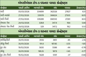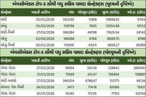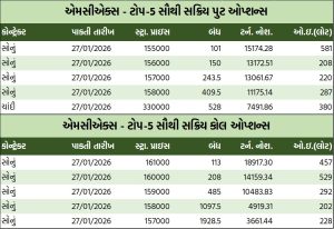 કોમોડિટી વાયદા પરના ઓપ્શન્સમાં કોલ ઓપ્શન્સની વાત કરીએ તો, ક્રૂડ તેલ ફેબ્રુઆરી રૂ.5600ની સ્ટ્રાઇક પ્રાઇસવાળો કોલ ઓપ્શન બેરલદીઠ રૂ.42.3 ઘટી રૂ.234.6 થયો હતો. જ્યારે નેચરલ ગેસ ફેબ્રુઆરી રૂ.350ની સ્ટ્રાઇક પ્રાઇસવાળો કોલ ઓપ્શન એમએમબીટીયૂદીઠ રૂ.13.55 વધી રૂ.40.25ના ભાવે બોલાયો હતો.