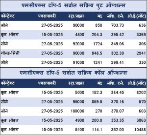मौल्यवान धातूंमध्ये, सोने आणि चांदीचे वायदामध्ये 4722.27 कोटी रुपयांची उलाढाल झाली. एमसीएक्स सोने जून वायदा सत्राच्या सुरुवातीला 93444 रुपयांवर उघडला, दिवसाच्या उच्चांकी 96300 रुपयांवर आणि नीचांकी 92120 रुपयांवर पोहोचल्या आणि 94702 रुपयांच्या मागील बंदच्या तुलनेत 2575 रुपये किंवा 2.72 टक्का घसरून 92127 प्रति 10 ग्रॅमवर आला. गोल्ड-गिनी मे वायदा 1882 रुपये किंवा 2.47 टक्का घसरून 74438 प्रति 8 ग्रॅमच्या पातळीवर ट्रेड करत होता. गोल्ड-पैटल मे वायदा 243 रुपये किंवा 2.54 टक्का घसरून 9333 प्रति 1 ग्रॅमच्या पातळीवर ट्रेड करत होता. गोल्ड-मिनी मे वायदा सत्राच्या सुरुवातीला 92850 रुपयांवर उघडला, 92886 रुपयांचा उच्चांक आणि 92414 रुपयांचा नीचांक गाठला आणि 2129 रुपये किंवा 2.25 टक्क्यांच्या घसरणीसह 92436 प्रति 10 ग्रॅमच्या पातळीवर ट्रेड करत होता. गोल्ड-टेन मे वायदा प्रति 10 ग्रॅम सत्राच्या सुरुवातीला 94105 रुपयांवर उघडला, 94105 रुपयांचा उच्चांक आणि 92522 रुपयांचा नीचांक गाठला आणि 94949 रुपयांच्या मागील बंदच्या तुलनेत 2427 रुपये किंवा 2.56 टक्क्यांच्या घसरणीसह 92522 प्रति 10 ग्रॅमच्या पातळीवर ट्रेड करत होता.