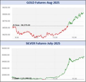मौल्यवान धातूंमध्ये, सोने आणि चांदीचे वायदामध्ये 18536.48 कोटी रुपयांची उलाढाल झाली. एमसीएक्स सोने ऑगस्ट वायदा सत्राच्या सुरुवातीला 98456 रुपयांवर उघडला, 99160 रुपयांचा उच्चांक आणि 98120 रुपयांचा नीचांक गाठला आणि 98579 रुपयांच्या मागील बंदच्या तुलनेत 562 रुपये किंवा 0.57 टक्क्यांच्या वाढीसह 99141 प्रति 10 ग्रॅम झाला. गोल्ड-गिनी जून वायदा 515 रुपये किंवा 0.66 टक्क्यांच्या वाढीसह 79074 प्रति 8 ग्रॅमवर आला. गोल्ड-पैटल जून वायदा 61 रुपये किंवा 0.62 टक्कानी वाढून 9902 प्रति 1 ग्रॅमच्या पातळीवर ट्रेड करत होता. गोल्ड-मिनी जून वायदा सत्राच्या सुरुवातीला 97499 रुपयांवर उघडला, 98794 रुपयांचा उच्चांक आणि 97012 रुपयांचा नीचांक गाठला आणि 829 रुपये किंवा 0.85 टक्क्यांच्या वाढीसह 98190 प्रति 10 ग्रॅमच्या पातळीवर ट्रेड करत होता. गोल्ड-टेन जून वायदा प्रति 10 ग्रॅम सत्राच्या सुरुवातीला 98101 रुपयांवर उघडला, दिवसाच्या उच्चांकी 98739 रुपयांवर आणि नीचांकी 97700 रुपयांवर पोहोचल्या आणि 98108 रुपयांच्या मागील बंदच्या तुलनेत 622 रुपये किंवा 0.63 टक्कानी वाढून 98730 प्रति 10 ग्रॅम झाला.