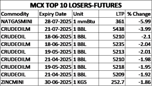 क्रूड ऑइल आणि क्रूड ऑइल-मिनीचे वायदामध्ये 1647.57 कोटी रुपयांचे सौदे झाले. नेचरल गैस और नेचरल गैस-मिनीचे वायदामध्ये 1286.57 कोटी रुपयांची उलाढाल झाली. मेंथा ऑइल वायदामध्ये 3.71 कोटी रुपयांची उलाढाल झाली. कॉटन कँडी वायदामध्ये 0.59 कोटी रुपयांचे सौदे झाले.