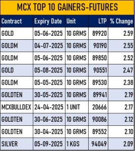 मौल्यवान धातूंमध्ये, सोने आणि चांदीचे वायदामध्ये 20367.47 कोटी रुपयांची उलाढाल झाली. एमसीएक्स सोने जून वायदा सत्राच्या सुरुवातीला 87998 रुपयांवर उघडला, 90077 रुपयांचा उच्चांक आणि 87998 रुपयांचा नीचांक गाठला आणि 87648 रुपयांच्या मागील बंदच्या तुलनेत 2272 रुपये किंवा 2.59 टक्क्यांच्या वाढीसह 89920 प्रति 10 ग्रॅमवर आला. गोल्ड-गिनी एप्रिल वायदा 1235 रुपये किंवा 1.75 टक्कानी वाढून 71867 प्रति 8 ग्रॅमवर आला. गोल्ड-पैटल एप्रिल वायदा 147 रुपये किंवा 1.65 टक्क्यांच्या वाढीसह 9033 प्रति 1 ग्रॅमच्या पातळीवर ट्रेड करत होता. गोल्ड-मिनी मे वायदा सत्राच्या सुरुवातीला 87650 रुपयांवर उघडला, दिवसाच्या उच्चांकी 89650 रुपयांवर आणि नीचांकी 87650 रुपयांवर पोहोचल्या आणि 2081 रुपये किंवा 2.38 टक्कानी वाढून 89530 प्रति 10 ग्रॅमच्या पातळीवर ट्रेड करत होता. गोल्ड-टेन एप्रिल वायदा प्रति 10 ग्रॅम सत्राच्या सुरुवातीला 88100 रुपयांवर उघडला, 89703 रुपयांचा उच्चांक आणि 88001 रुपयांचा नीचांक गाठला आणि 87706 रुपयांच्या मागील बंदच्या तुलनेत 1846 रुपये किंवा 2.1 टक्क्यांच्या वाढीसह 89552 प्रति 10 ग्रॅम झाला.