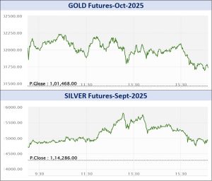 मौल्यवान धातूंमध्ये, सोने आणि चांदीचे वायदामध्ये 21604.77 कोटी रुपयांची उलाढाल झाली. एमसीएक्स सोने ऑक्टोबर वायदा सत्राच्या सुरुवातीला 101950 रुपयांवर उघडला, 102250 रुपयांचा उच्चांक आणि 101456 रुपयांचा नीचांक गाठला आणि 101468 रुपयांच्या मागील बंदच्या तुलनेत 252 रुपये किंवा 0.25 टक्क्यांच्या वाढीसह 101720 प्रति 10 ग्रॅमच्या पातळीवर ट्रेड करत होता. गोल्ड-गिनी ऑगस्ट वायदा 276 रुपये किंवा 0.34 टक्क्यांच्या वाढीसह 81238 प्रति 8 ग्रॅम झाला. गोल्ड-पैटल ऑगस्ट वायदा 22 रुपये किंवा 0.22 टक्कानी वाढून 10161 प्रति 1 ग्रॅमवर आला. गोल्ड-मिनी सप्टेंबर वायदा सत्राच्या सुरुवातीला 101200 रुपयांवर उघडला, 101584 रुपयांचा उच्चांक आणि 100885 रुपयांचा नीचांक गाठला आणि 296 रुपये किंवा 0.29 टक्क्यांच्या वाढीसह 101131 प्रति 10 ग्रॅमवर आला. गोल्ड-टेन ऑगस्ट वायदा प्रति 10 ग्रॅम सत्राच्या सुरुवातीला 101152 रुपयांवर उघडला, दिवसाच्या उच्चांकी 101703 रुपयांवर आणि नीचांकी 101152 रुपयांवर पोहोचल्या आणि 100944 रुपयांच्या मागील बंदच्या तुलनेत 276 रुपये किंवा 0.27 टक्कानी वाढून 101220 प्रति 10 ग्रॅमच्या पातळीवर ट्रेड करत होता.