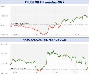 या कमोडिटीव्यतिरिक्त, व्यापाऱ्यांनी ऊर्जा क्षेत्रात 2250.50 कोटी रुपयांचे सौदे केले. एमसीएक्स क्रूड ऑइल ऑगस्ट वायदा सत्राच्या सुरुवातीला 5600 रुपयांवर उघडला, 5659 रुपयांचा उच्चांक आणि 5547 रुपयांचा नीचांक गाठला आणि 45 रुपये किंवा 0.8 टक्क्यांच्या वाढीसह 5649 प्रति बॅरलवर आला. क्रूड ऑइल-मिनी ऑगस्ट वायदा 40 रुपये किंवा 0.71 टक्क्यांच्या वाढीसह 5647 प्रति बॅरलच्या पातळीवर ट्रेड करत होता. नेचरल गैस ऑगस्ट वायदा सत्राच्या सुरुवातीला 270 रुपयांवर उघडला, दिवसाच्या उच्चांकी 272.7 रुपयांवर आणि नीचांकी 268 रुपयांवर पोहोचल्या आणि 268.7 रुपयांच्या मागील बंदच्या तुलनेत 10 पैसे किंवा 0.04 टक्कानी वाढून 268.8 प्रति एमएमबीटीयूवर आला. नेचरल गैस-मिनी ऑगस्ट वायदा 20 पैसे किंवा 0.07 टक्क्यांच्या सुधारणेसह 268.9 प्रति एमएमबीटीयूच्या पातळीवर ट्रेड करत होता.