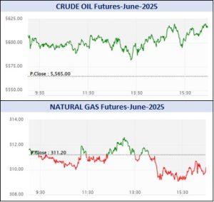 या कमोडिटीव्यतिरिक्त, व्यापाऱ्यांनी ऊर्जा क्षेत्रात 1267.10 कोटी रुपयांचे सौदे केले. एमसीएक्स क्रूड ऑइल जून वायदा सत्राच्या सुरुवातीला 5608 रुपयांवर उघडला, 5621 रुपयांचा उच्चांक आणि 5581 रुपयांचा नीचांक गाठला आणि 46 रुपये किंवा 0.83 टक्क्यांच्या वाढीसह 5611 प्रति बॅरलवर आला. क्रूड ऑइल-मिनी जून वायदा 47 रुपये किंवा 0.84 टक्कानी वाढून 5611 प्रति बॅरलवर आला. नेचरल गैस जून वायदा सत्राच्या सुरुवातीला 311.3 रुपयांवर उघडला, 312.8 रुपयांचा उच्चांक आणि 308.9 रुपयांचा नीचांक गाठला आणि 311.2 रुपयांच्या मागील बंदच्या तुलनेत 70 पैसे किंवा 0.22 टक्के नरमपणासह 310.5 प्रति एमएमबीटीयूच्या पातळीवर ट्रेड करत होता. नेचरल गैस-मिनी जून वायदा 90 पैसे किंवा 0.29 टक्के नरमपणासह 310.4 प्रति एमएमबीटीयूवर आला.