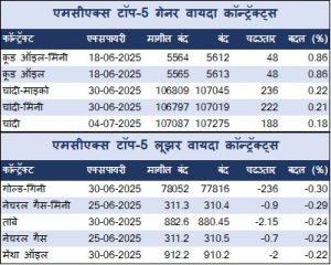 मौल्यवान धातूंमध्ये, सोने आणि चांदीचे वायदामध्ये 12696.50 कोटी रुपयांची उलाढाल झाली. एमसीएक्स सोने ऑगस्ट वायदा सत्राच्या सुरुवातीला 96600 रुपयांवर उघडला, दिवसाच्या उच्चांकी 97189 रुपयांवर आणि नीचांकी 96276 रुपयांवर पोहोचल्या आणि 97173 रुपयांच्या मागील बंदच्या तुलनेत 3 रुपये किंवा 0 टक्का घसरून 97170 प्रति 10 ग्रॅमच्या पातळीवर ट्रेड करत होता. गोल्ड-गिनी जून वायदा 236 रुपये किंवा 0.3 टक्क्यांच्या घसरणीसह 77816 प्रति 8 ग्रॅमच्या पातळीवर ट्रेड करत होता. गोल्ड-पैटल जून वायदा कोणताही बदल न करता 9766 प्रति 1 ग्रॅम झाला. गोल्ड-मिनी जुलै वायदा सत्राच्या सुरुवातीला 96477 रुपयांवर उघडला, 96700 रुपयांचा उच्चांक आणि 95877 रुपयांचा नीचांक गाठला आणि 5 रुपये किंवा 0.01 टक्क्यांच्या घसरणीसह 96698 प्रति 10 ग्रॅम झाला. गोल्ड-टेन जून वायदा प्रति 10 ग्रॅम सत्राच्या सुरुवातीला 96700 रुपयांवर उघडला, दिवसाच्या उच्चांकी 96882 रुपयांवर आणि नीचांकी 96117 रुपयांवर पोहोचल्या आणि 96963 रुपयांच्या मागील बंदच्या तुलनेत 86 रुपये किंवा 0.09 टक्का घसरून 96877 प्रति 10 ग्रॅमवर आला.
