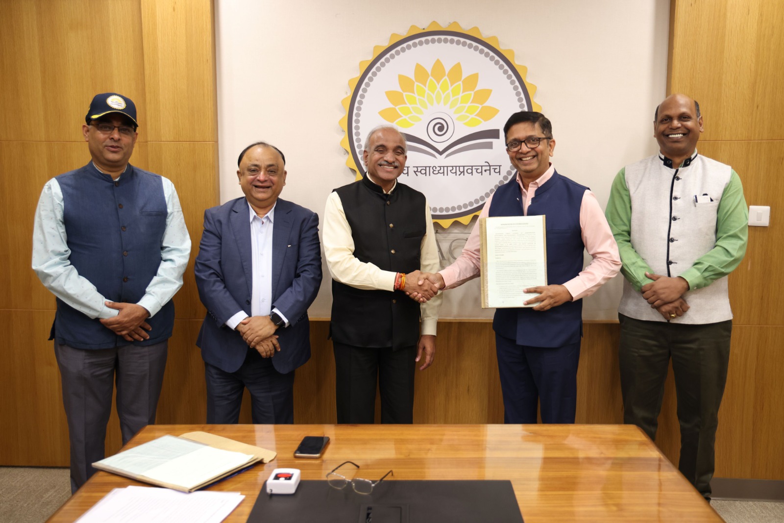 सामंजस्य करारावर स्वाक्षरी केल्यानंतर हस्तांदोलन करताना भारतीय व्यवस्थापन संस्था, नागपूरचे संचालक प्रा. भीमराया मेत्री आणि अतिरिक्त पीसीसीएफ (वन्यजीव) एम. एस. रेड्डी. (डावीकडून) आय. आय. एम. नागपूरचे प्रा. आलोक कुमार सिंह, प्रा. अनुप कुमार आणि सी. एफ. ए. चे प्राचार्य उमेश वर्मा
