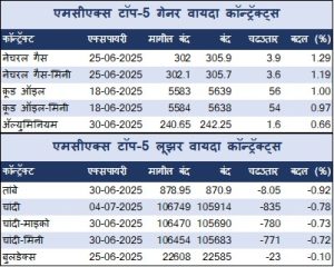 मौल्यवान धातूंमध्ये, सोने आणि चांदीचे वायदामध्ये 9974.06 कोटी रुपयांची उलाढाल झाली. एमसीएक्स सोने ऑगस्ट वायदा सत्राच्या सुरुवातीला 97249 रुपयांवर उघडला, 97395 रुपयांचा उच्चांक आणि 96976 रुपयांचा नीचांक गाठला आणि 96902 रुपयांच्या मागील बंदच्या तुलनेत 123 रुपये किंवा 0.13 टक्क्यांच्या वाढीसह 97025 प्रति 10 ग्रॅमवर आला. गोल्ड-गिनी जून वायदा 58 रुपये किंवा 0.07 टक्कानी वाढून 77785 प्रति 8 ग्रॅमवर आला. गोल्ड-पैटल जून वायदा 10 रुपये किंवा 0.1 टक्क्यांच्या वाढीसह 9755 प्रति 1 ग्रॅमच्या पातळीवर ट्रेड करत होता. गोल्ड-मिनी जुलै वायदा सत्राच्या सुरुवातीला 96668 रुपयांवर उघडला, दिवसाच्या उच्चांकी 96862 रुपयांवर आणि नीचांकी 96501 रुपयांवर पोहोचल्या आणि 130 रुपये किंवा 0.13 टक्कानी वाढून 96572 प्रति 10 ग्रॅमच्या पातळीवर ट्रेड करत होता. गोल्ड-टेन जून वायदा प्रति 10 ग्रॅम सत्राच्या सुरुवातीला 97013 रुपयांवर उघडला, 97013 रुपयांचा उच्चांक आणि 96675 रुपयांचा नीचांक गाठला आणि 96699 रुपयांच्या मागील बंदच्या तुलनेत 41 रुपये किंवा 0.04 टक्क्यांच्या वाढीसह 96740 प्रति 10 ग्रॅम झाला.