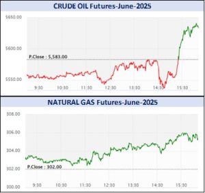 क्रूड ऑइल आणि क्रूड ऑइल-मिनीचे वायदामध्ये 856.93 कोटी रुपयांचे सौदे झाले. नेचरल गैस और नेचरल गैस-मिनीचे वायदामध्ये 769.88 कोटी रुपयांची उलाढाल झाली. मेंथा ऑइल वायदामध्ये 1.22 कोटी रुपयांची उलाढाल झाली.