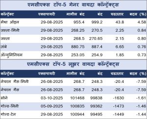 या कालावधीत मौल्यवान धातूंमध्ये सोने-चांदी वायद्यांमध्ये 133486.63 कोटी रुपयांची खरेदी-विक्री झाली. एमसीएक्स सोने ऑक्टोबर वायदा 101950 रुपयांवर उघडला, सप्ताहादरम्यान इंट्रा-डेमध्ये उच्चांकी 102250 रुपये आणि नीचांकी 99663 रुपये झाला, आणि मागील बंद 101468 रुपयांच्या तुलनेत सप्ताहाच्या शेवटी 1630 रुपये किंवा 1.61 टक्क्यांनी घसरून 99838 रुपये प्रति 10 ग्रॅमवर बंद झाला. गोल्ड-गिनी ऑगस्ट वायदा सप्ताहाच्या शेवटी 997 रुपये किंवा 1.23 टक्क्यांनी घसरून 79965 रुपये प्रति 8 ग्रॅमवर बंद झाला. गोल्ड-पेटल ऑगस्ट वायदा 118 रुपये किंवा 1.16 टक्क्यांनी घसरून सप्ताहाच्या शेवटी 10021 रुपये प्रति 1 ग्रॅमवर बंद झाला. सोने-मिनी सप्टेंबर वायदा 101200 रुपयांवर उघडला, सप्ताहादरम्यान इंट्रा-डेमध्ये उच्चांकी 101584 रुपये आणि नीचांकी 99208 रुपये झाला, आणि सप्ताहाच्या शेवटी 1473 रुपये किंवा 1.46 टक्क्यांनी घसरून 99362 रुपये प्रति 10 ग्रॅमवर बंद झाला. गोल्ड-टेन ऑगस्ट वायदा प्रति 10 ग्रॅम 101152 रुपयांवर उघडला, सप्ताहादरम्यान इंट्रा-डेमध्ये उच्चांकी 101703 रुपये आणि नीचांकी 99315 रुपये झाला, आणि मागील बंद 100944 रुपयांच्या तुलनेत सप्ताहाच्या शेवटी 1449 रुपये किंवा 1.44 टक्क्यांनी घसरून 99495 रुपये प्रति 10 ग्रॅमवर बंद झाला.