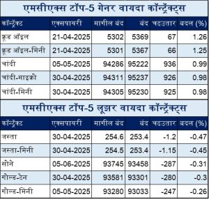 व्यापाराच्या बाबतीत, एमसीएक्सवर सोनेच्या विविध करारांमध्ये 1199.30 कोटी रुपयांचे आणि चांदीच्या विविध करारांमध्ये 934.63 कोटी रुपयांचे सौदे झाले. याशिवाय, तांबाचे वायदामध्ये 173.71 कोटी रुपया, ॲल्युमिनियम आणि ॲल्युमिनियम-मिनीचे वायदामध्ये 25.02 कोटी रुपया, शिसे आणि शिसे-मिनीचे वायदामध्ये 8.30 कोटी रुपया, जस्ता आणि जस्ता-मिनीचे वायदामध्ये 63.91 कोटी रुपयांचे सौदे झाले.