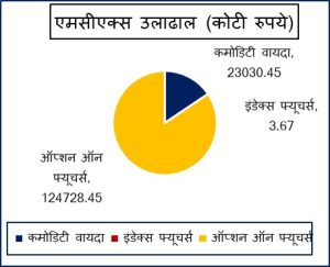 मुंबई: देशातील आघाडीचे कमोडिटी डेरिव्हेटिव्ह एक्सचेंज, एमसीएक्सवर कमोडिटी वायदा, ऑप्शन्स आणि इंडेक्स फ्युचर्समध्ये 147762.58 कोटी रुपयांची उलाढाल नोंदवण्यात आली. कमोडिटी वायदामध्ये 23030.45 कोटी रुपयांची उलाढाल झाली, तर कमोडिटी ऑप्शन्समध्ये 124728.45 कोटी रुपयांची (कल्पनात्मक) उलाढाल झाली. बुलियन इंडेक्स बुलडेक्स एप्रिल वायदा 21893 अंकांच्या पातळीवर ट्रेड करत होता. कमोडिटी ऑप्शन्समध्ये एकूण प्रीमियम उलाढाल 1199.3 कोटी रुपये होती.